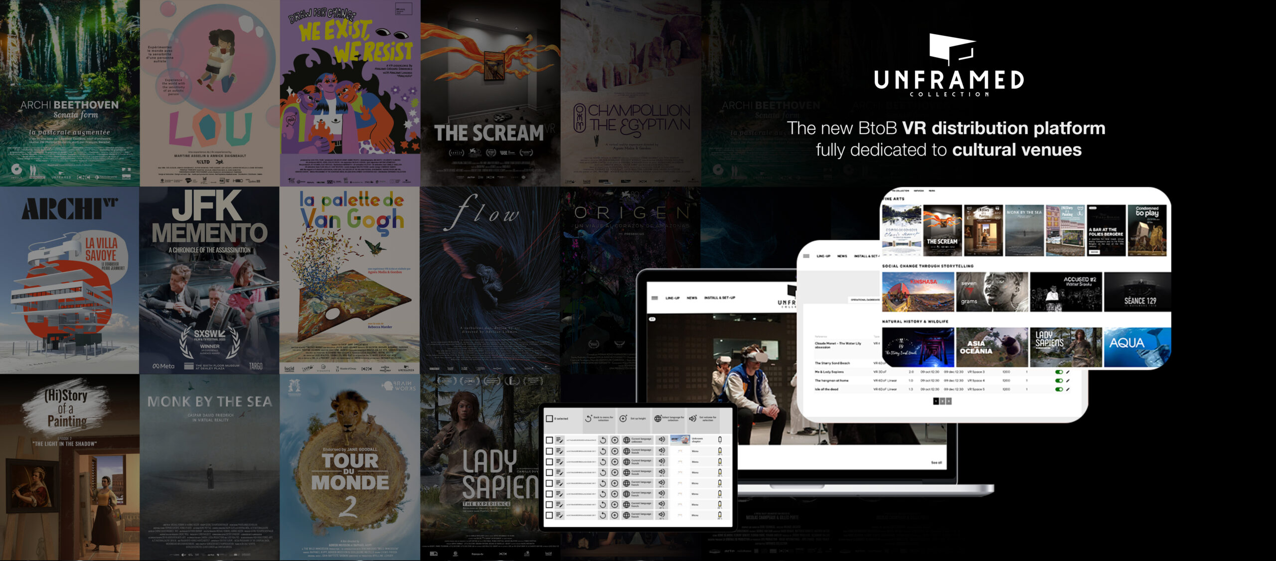 Unframed Collection is the first turnkey platform dedicated to the B2B distribution of immersive experiences for cultural and educational institutions. The platform offers an editorialised catalogue of works – mainly virtual reality – covering a wide variety of themes (fine arts, history, animation, documentary, cinema, science, society, dance, music, etc.), services, and tools designed to help distribution venues deploy immersive setups.