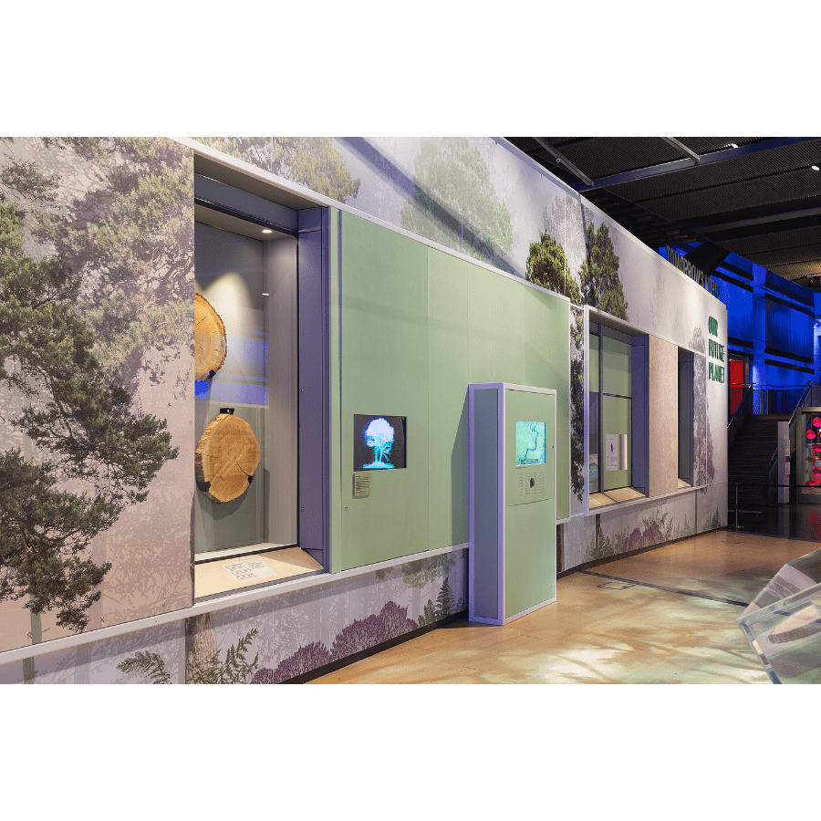 This section of the exhibition explores the role of forests and other natural ecosystems in removing CO2 from the atmosphere. Visitors are encouraged to look at these environments in a new way – as places of active scientific research.