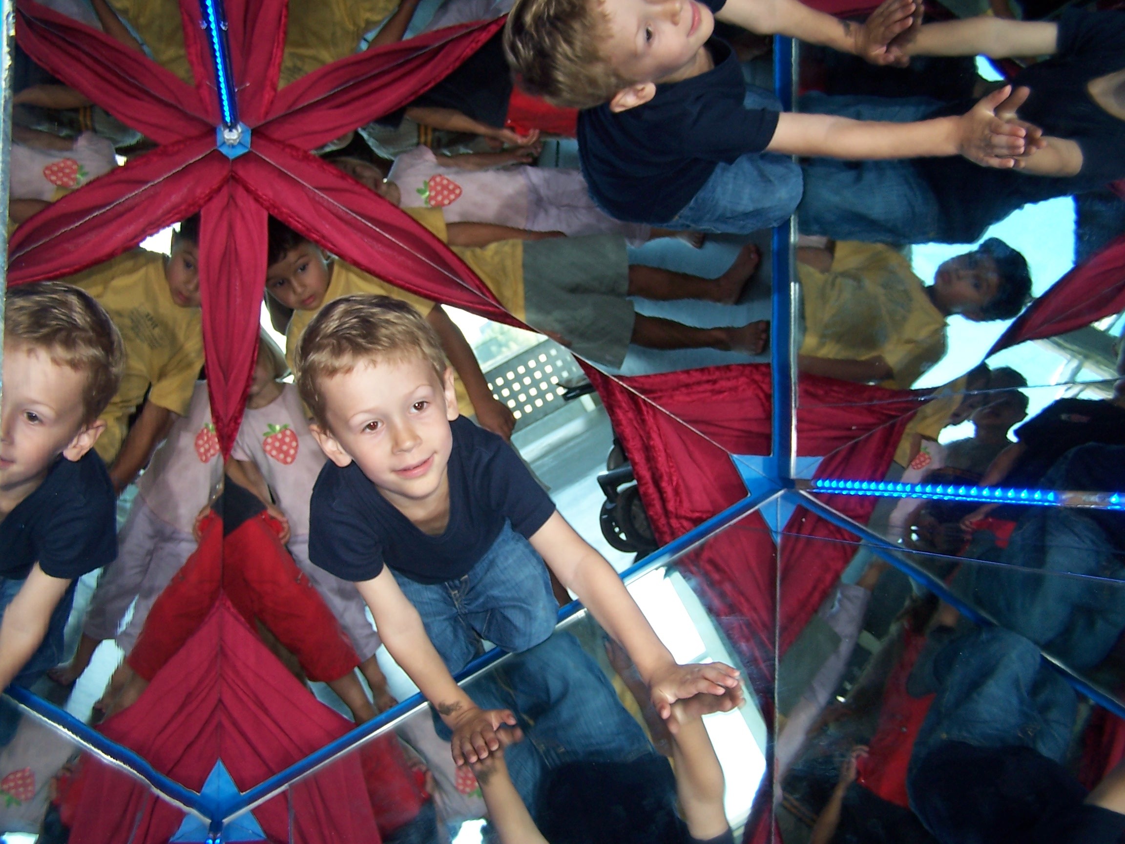The setting immerses the children in the heart of a timeless fun fair which could have set up camp in the middle of a field. The tour takes place through 3 workshop areas: one thousand and one reflections of my body, my body is a shadow and the features of my body.
